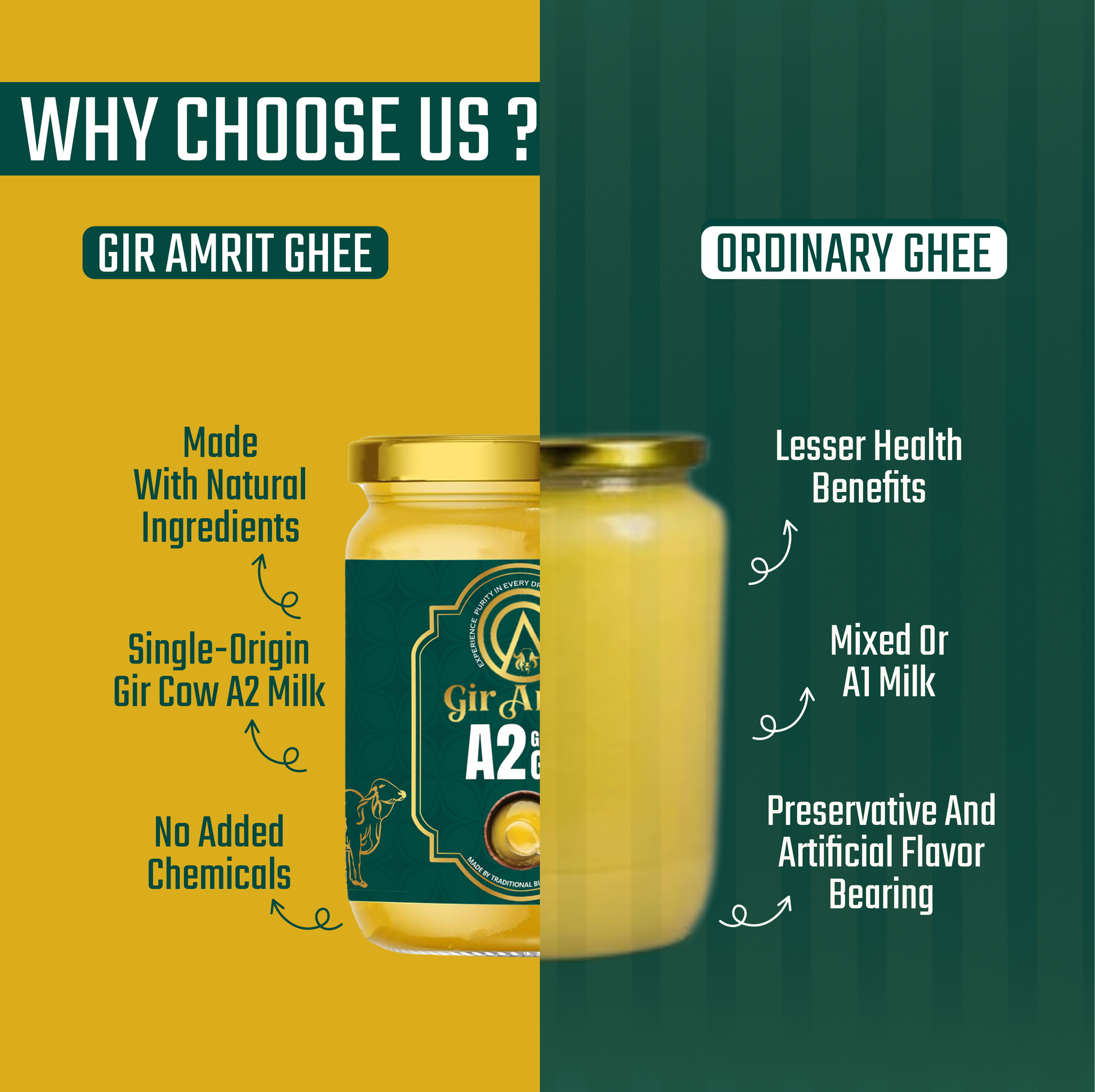 Experience the richness of tradition and the purity of nature with Gir Amrit A2 Gir Cow Ghee. Sourced from indigenous Gir cows and crafted using the traditional Bilona method, our ghee is 100% natural, preservative-free, and packed with health benefits.